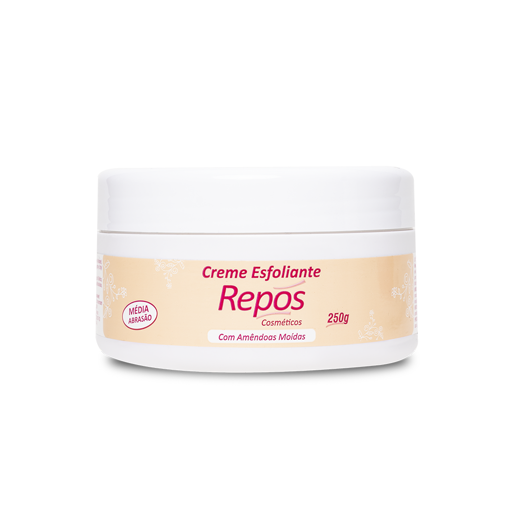 O creme esfoliante da Repós contém em sua formulação amêndoas moídas que além de esfoliar a pele, regenera e da macies.